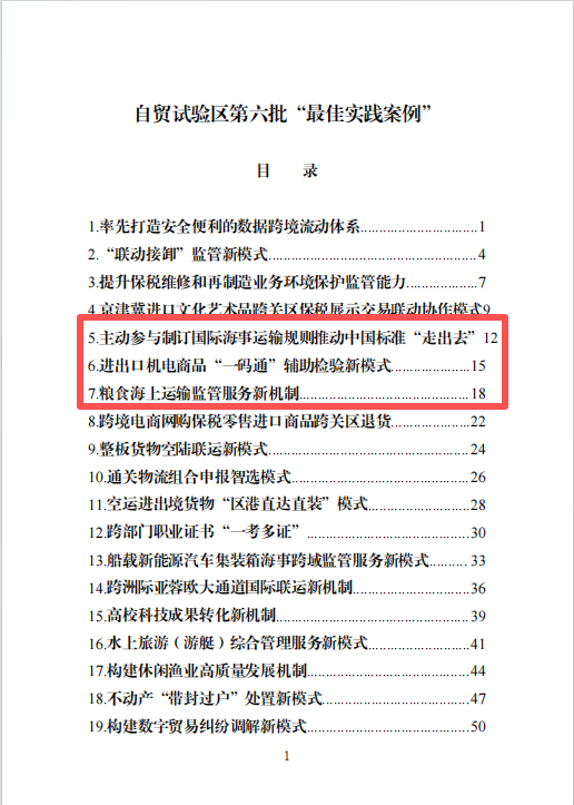 第六批“最佳实践案例”全国22个自贸试验区共有29项案例入选,辽宁自贸试验区3项案例成功入选。一是“主动参与制定国际海事运输规则 推动中国标准‘走出去’”。针对部分货物因国际运输规则限制导致海运出口难、成本高等问题,大连片区主动靠前深入企业,通过对标国际标准,提出中国方案,从根本上帮助企业解决出口难题,推动特殊品类货物安全合规出海。二是进出口机电商品“一码通”辅助检验新模式。沈阳片区建立进出口机电商品检验监管辅助执法数据模型,按照商品编码进行检索,实现商品风险、业务要求、管理规定的系统化查询,自动匹配产品相应监管、检验规定,为海关执法提供科学依据。三是“粮食海上运输监管服务新机制”。为保障粮食海上运输通道安全畅通,大连片区会同营口片区联合打造粮食海上运输监管服务新机制,有效提升监管能力和服务水平,为搭建高效、便捷、低成本的南北粮食物流运输大通道提供了有力保障。
